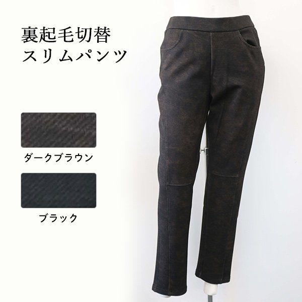 前面に縦切替、膝横切替を配したおしゃれなスエード柄のスリムパンツ。