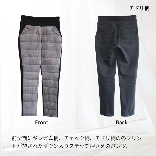 前全面にギンガム柄、チェック柄、チドリ柄の各プリントが施されたダウン入りステッチ押さえのパンツ。