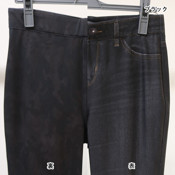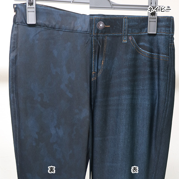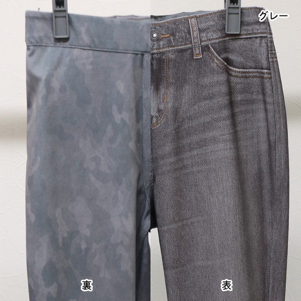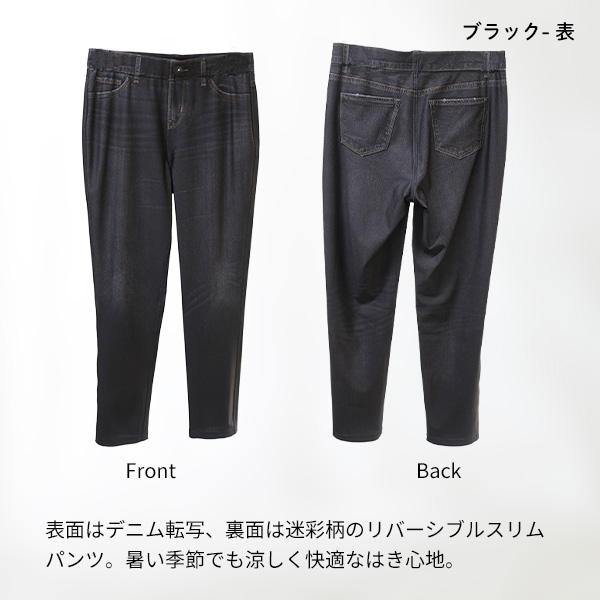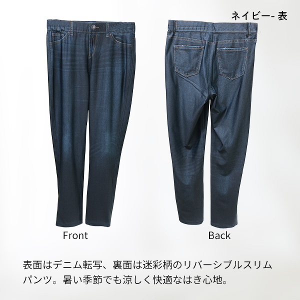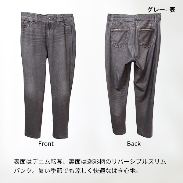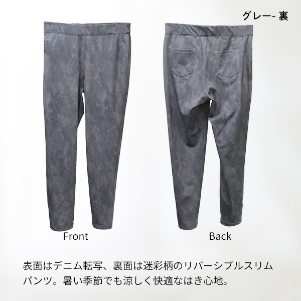 表面はデニム転写、裏面は迷彩柄のリバーシブルスリムパンツ。